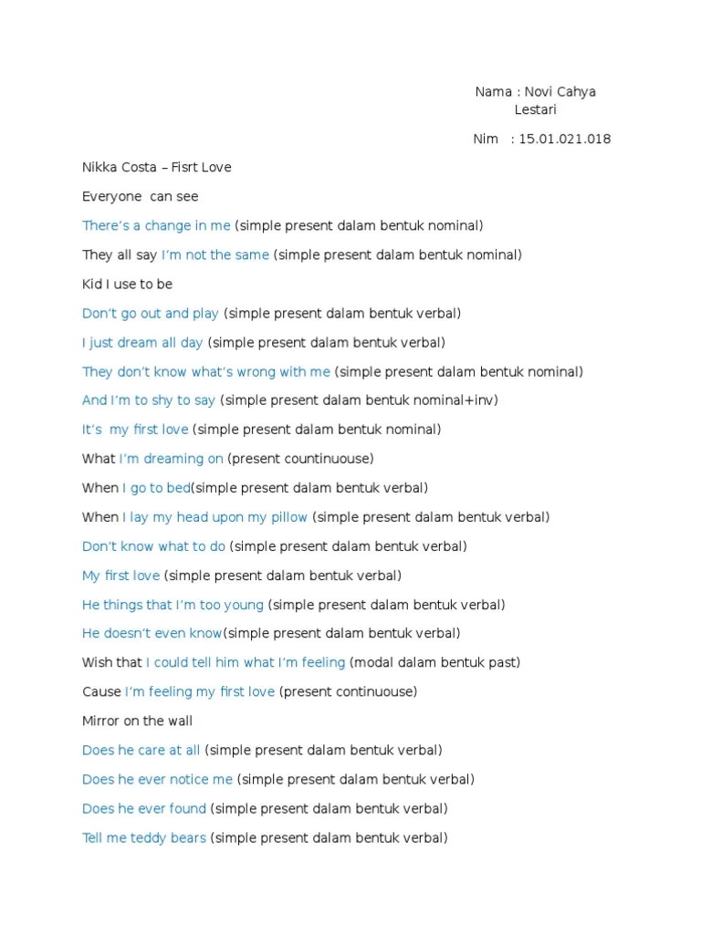 Terjemahan lirik lagu first love dari nikka costa memang terasa biasa saja tapi setelah mendengarkan lagunya maka kamu akan senang dengan . There's a change in me. First love | cinta pertama. My first love (cover ardhito pramono) | nikka costa | terjemahan lirik lagu barat newbie. Semua orang bisa melihat., itulah cuplikan liriknya.